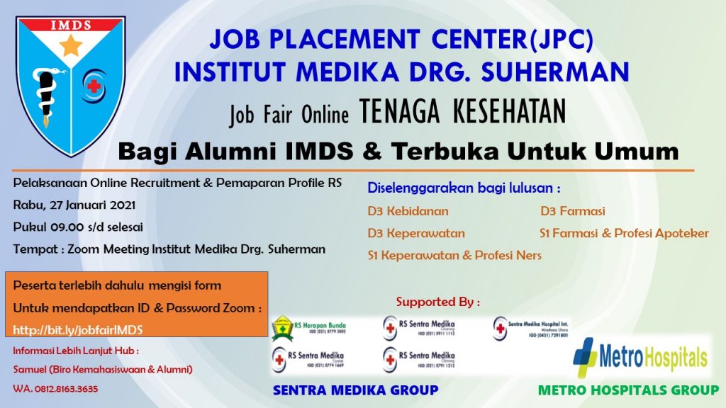 Dalam rangka memberikan jembatan kepada para alumni dan steakholder dalam rangka pemenuhan kebutuhan tenaga kerja dan pengembangan karir, JOB PLACEMENT CENTER (JPC) INSTITUT MEDIKA DRG. SUHERMAN bekerjasama dengan Sentra Medika Group dan Metro Hospitals Group mengadakan job fair online, yang akan diselenggarakan pada :
