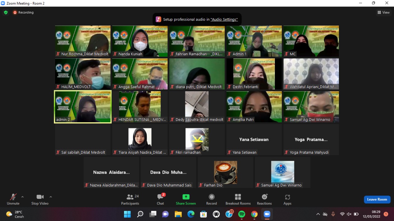 Kegiatan diselenggarakan secara online karena pandemi Covid-19 masuk PPKM Level 3 di Kab. Bekasi dan Jawa Barat. Peserta yang tedata mencapai 16 Peserta, DIKLAT MEDVOLT bertujuan untuk menumbuhkan mental pada calon anggota serta memiliki rasa kebersamaan, loyalitas, dedikasi yang tinggi, menjalankan sportivitas, komunikatif, solidaritas sebagai bentuk kepedulian terhadap nilai sejarah, seni dan budaya serta organisasi di UKM MEDVOLT dan tujuan luhur kegiatan menjadi kerelawan yang tangguh.#Red.Dilla