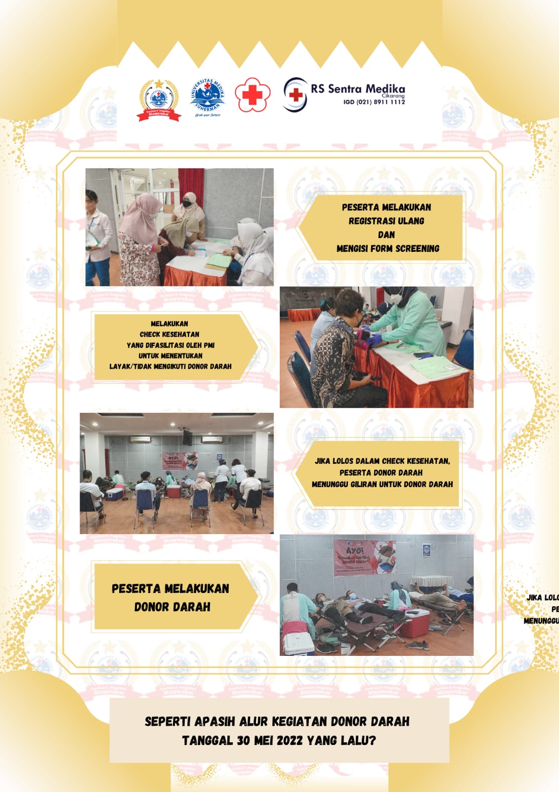 Senin, 30 Mei 2022 Unit Kegiatan Mahasisa (UKM) Penelitian & Pengabdian Masyarakat (P2M) sukses menggelar acara donor darah, kegiatan ini bekerja sama dengan RS. Sentra Medika Cikarang dan PMI Kab. Bekasi.