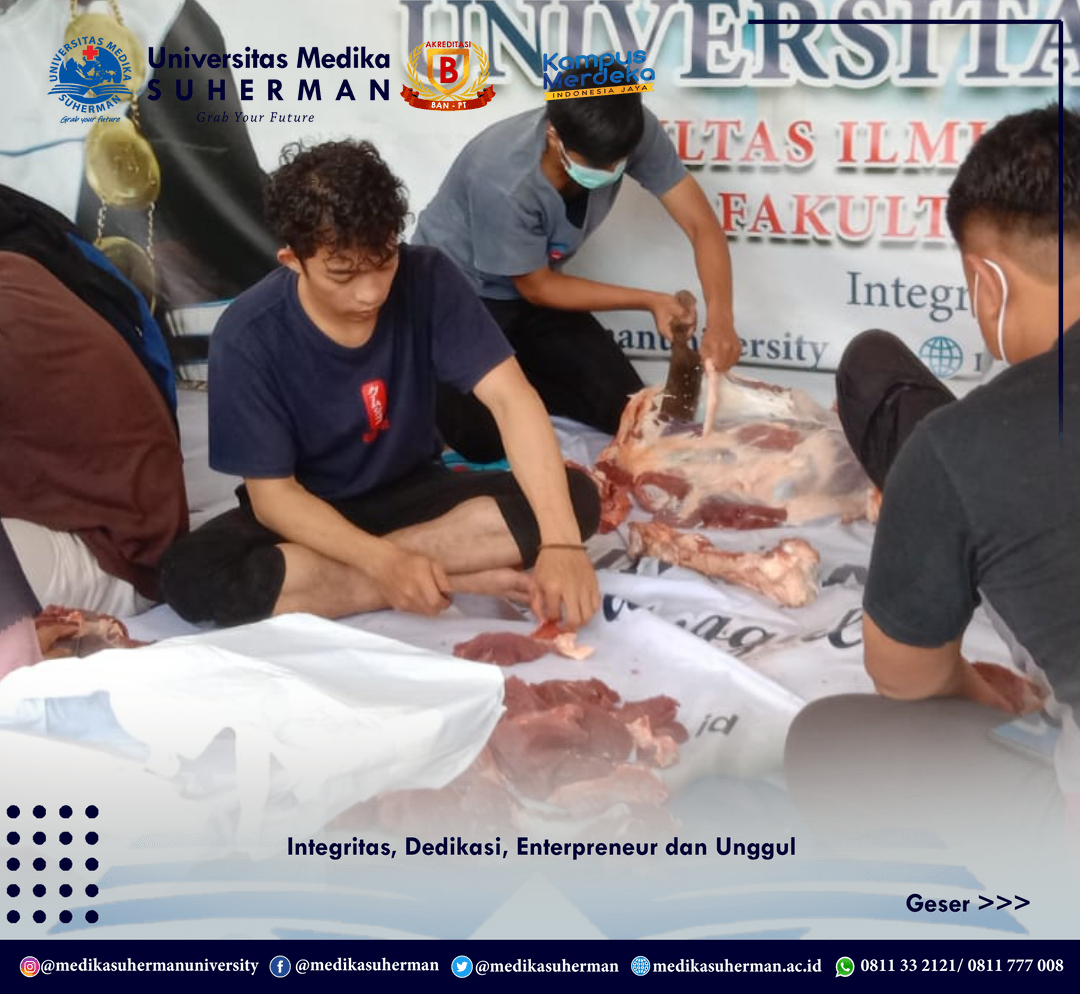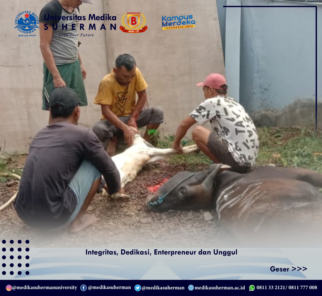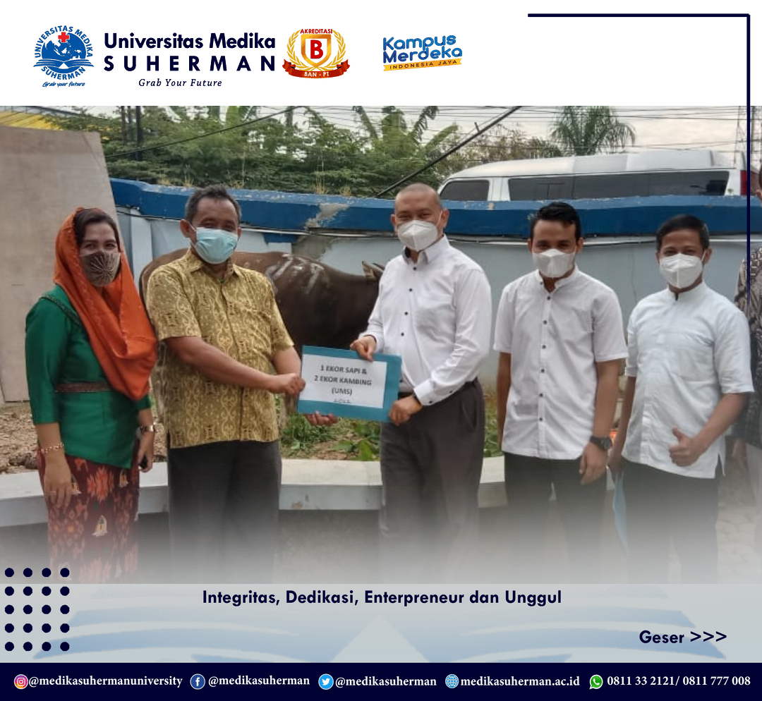 Cikarang, 11 Juli 2022 – Dalam rangka memperingati Hari Raya Idul Adha 1443 H yang jatuh pada hari Minggu 10 Juli 2022, Universitas Medika Suherman ikut berpartisipasi melaksanakan kegiatan pemotongan hewan Qurban. Kegiatan ini rutin dilaksanakan setiap tahun dengan melibatkan civitas akademika Universitas Medika Suherman (UMS), para sponsor dari relasi dan para alumni.