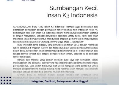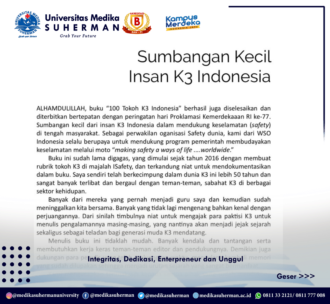 Selamat dan Sukses atas Prestasi Bapak Agung Supriyadi, SKM., MKKK. Dosen Program Studi Sarjana Terapan Keselamatan & Kesehatan Kerja (K3) Fakultas Ilmu Vokasi, Universitas Medika Suherman (UMS) Terpilih menjadi Salah Satu dari 100 Tokoh K3 Indonesia yang berkontribusi dalam mengambangkan Keilmuan K3 dari Hasil Menulis di dalam Websitenya yaitu www.katigaku.top dalam dalam Soft Launching Buku 100 Tokoh K3 dalam kegiatan WSO Festival Fire and Safety pada 5 Juli 2022, di Gedung Kantor Pusat Pertamina Medan Merdeka Selatan Jakarta, yang diselenggarkan oleh WSO Indonesia didukung MPK2I dan Pertamina. Kegiatan Launching akan diselenggarakan pada tanggal 17 Agustus 2022. Buku dapat dipesan melalui email [email protected] atau wa.me/+6282211918880. #Red.MKT.