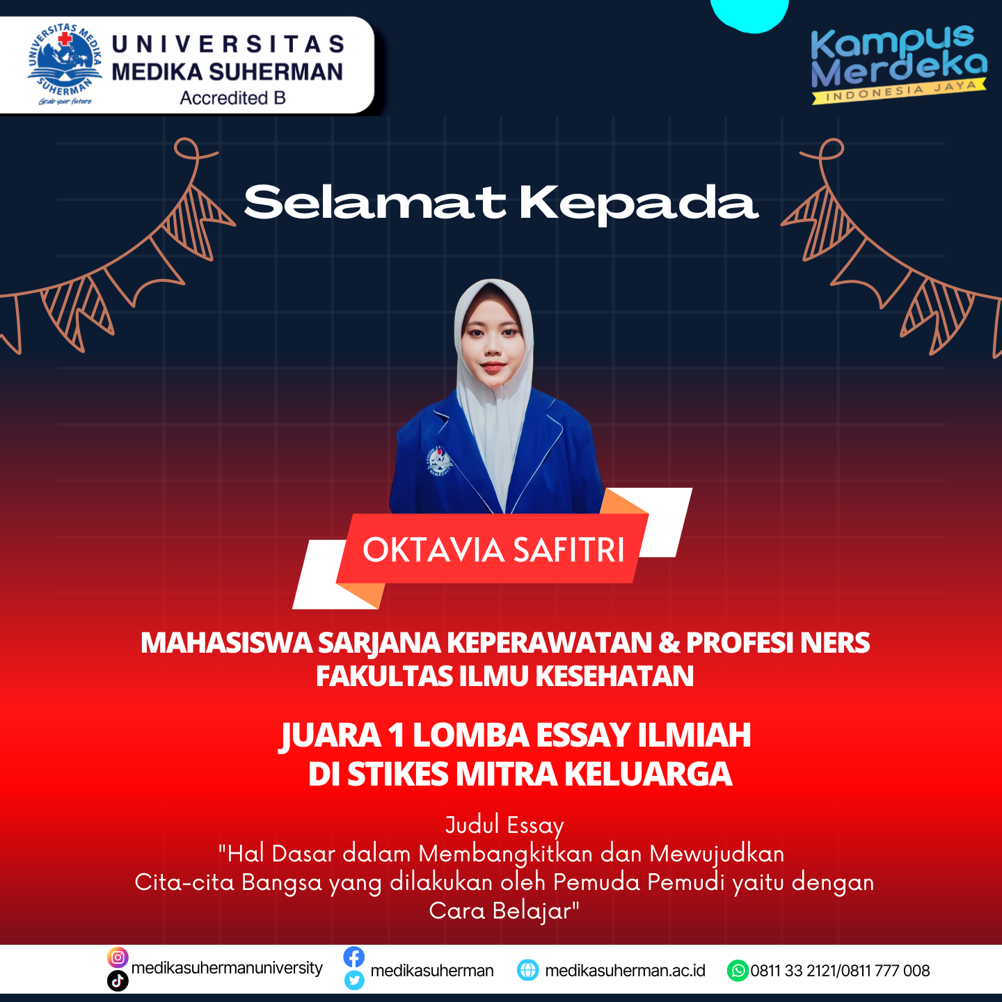 Selamat Kepada Oktavia Safitri Mahasiswa Sarjana Keperawatan dan Profesi Ners mendapatkan Juara 1 Lomba Essay Ilmiah di STIKES Mitra Keluarga dengan judul “Hal Dasar dalam Membangkitkan dan Mewujudkan Cita-cita Bangsa yang dilakukan oleh Pemuda-pemudi yaitu dengan Cara Belajar”