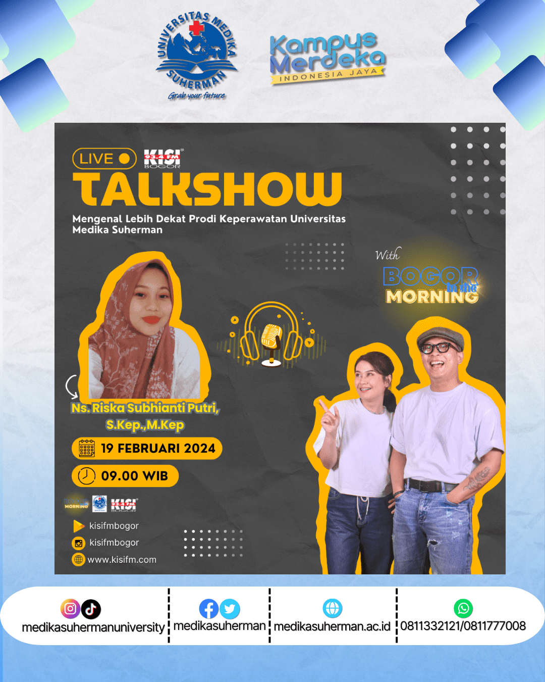Bersama Narasumber Ibu Ns.Riska Subhianti Putri, S.Kep., M.Kep di Kisi FM Bogor yang akan membahas program studi keperawatan di Universitas Medika Suherman.