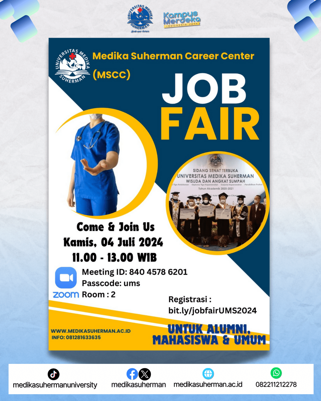 Bergabunglah dengan kami di Job Fair 2024 dan temukan berbagai peluang karier di sektor kesehatan dan industri lainnya! Bertemu dengan perusahaan terkemuka, pelajari tren terbaru di dunia kerja, dan perluas jaringan profesional Anda.