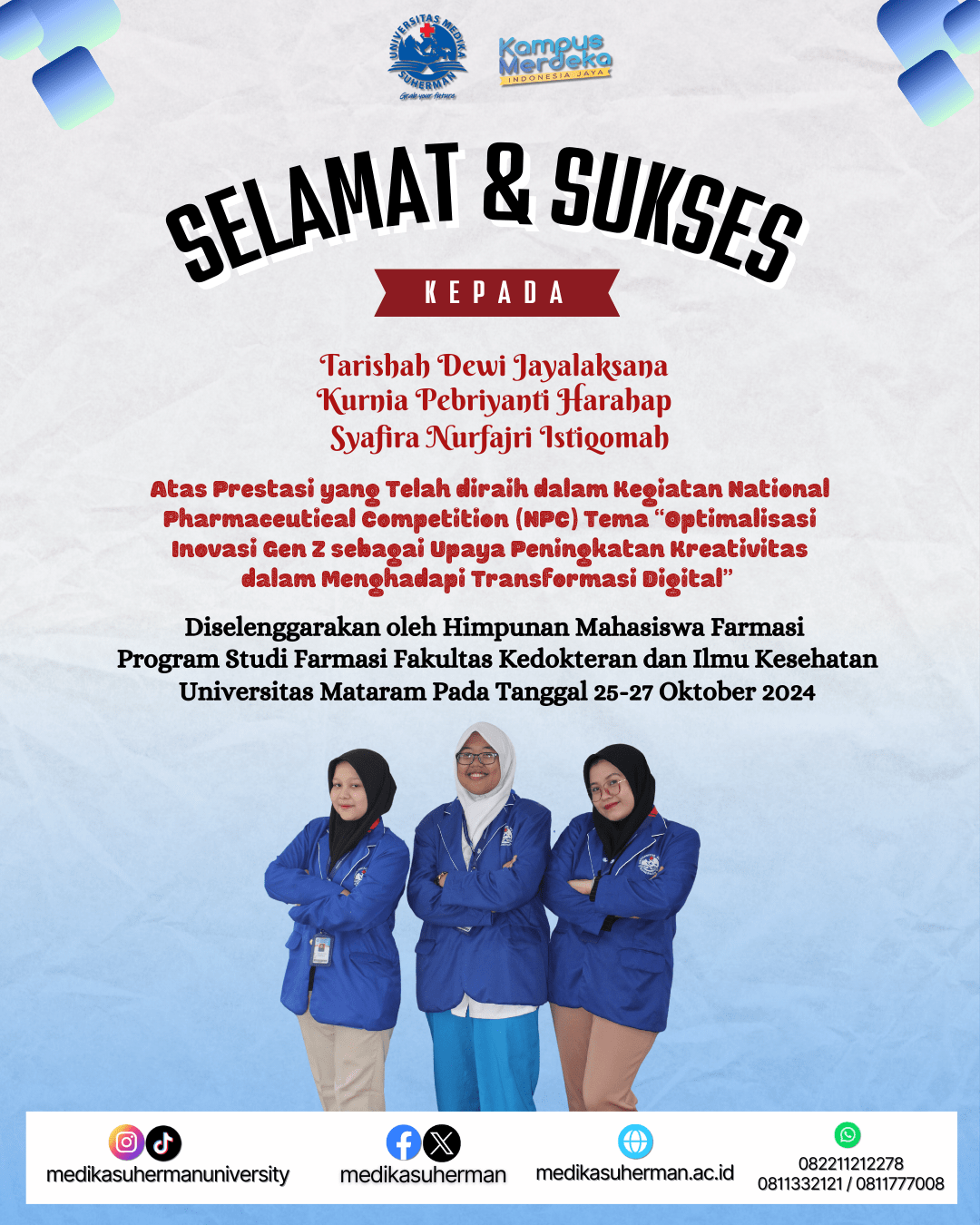 Selamat atas prestasi yang telah diraih oleh Kurnia (Sarjana Farmasi), Tarishah (D4 Keperawatan Anestesiologi) dan Syafira (Sarjana Kebidanan) dalam kegiatan National Pharmaceutical Competition (NPC) dengan Tema “Optimalisasi Inovasi Gen Z sebagai Upaya Peningkatan Kreativitas dalam Menghadapi Transformasi Digital” oleh Himpunan Mahasiswa Farmasi Program Studi Farmasi Fakultas Kedokteran dan Ilmu Kesehatan Universitas Mataram Pada Tanggal 25-27 Oktober 2024.