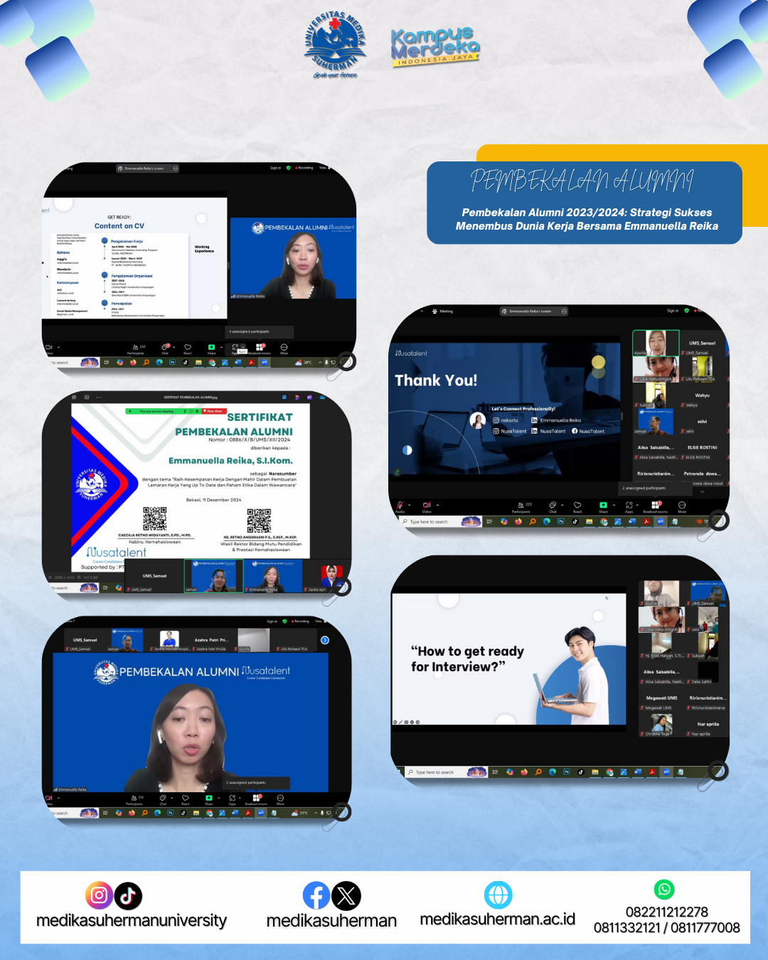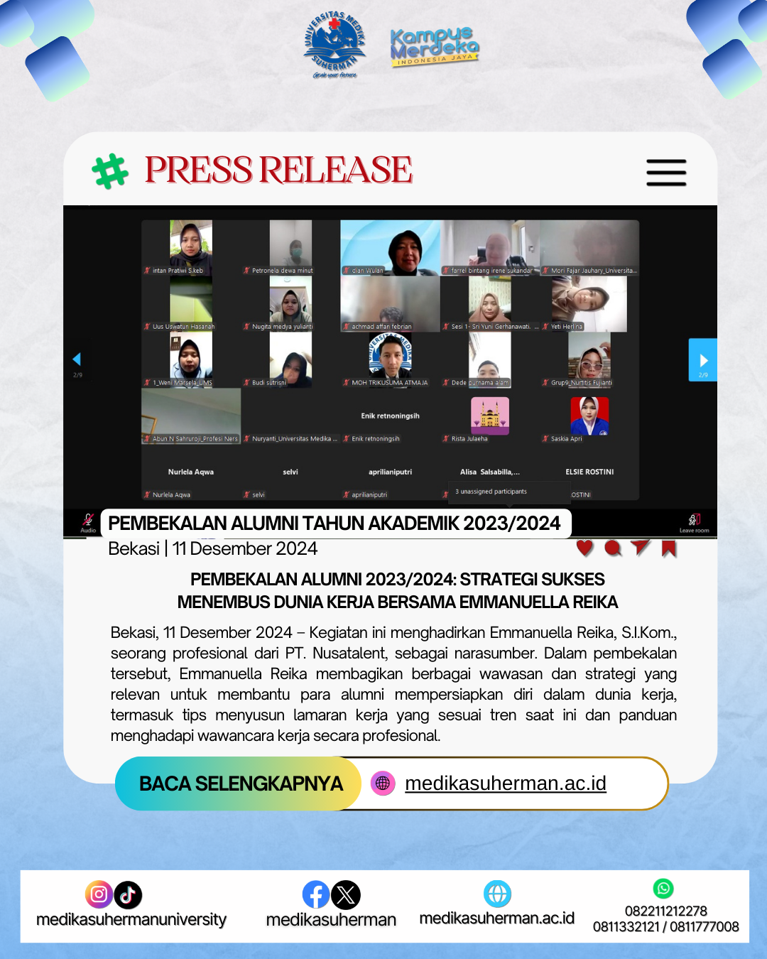 Dengan adanya pembekalan ini, diharapkan para alumni dapat lebih siap menghadapi persaingan di dunia kerja dan memanfaatkan peluang karier secara maksimal. Kegiatan ini juga menjadi bentuk komitmen Universitas Medika Suherman dalam mendukung keberhasilan lulusan di masa depan.