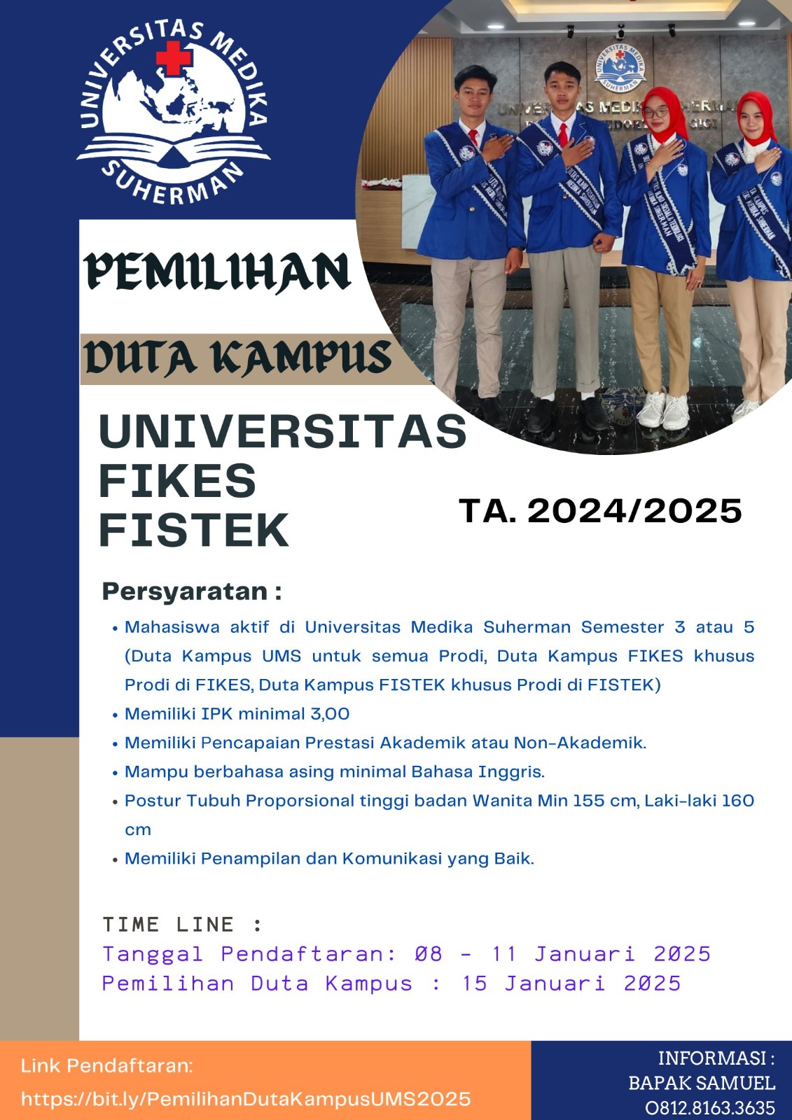 1. Mahasiswa aktif di Universitas Medika Suherman Semester 3 atau 5 (Duta Kampus UMS untuk semua Prodi, Duta Kampus FIKES khusus Prodi di FIKES, Duta Kampus FISTEK khusus Prodi di FISTEK)
