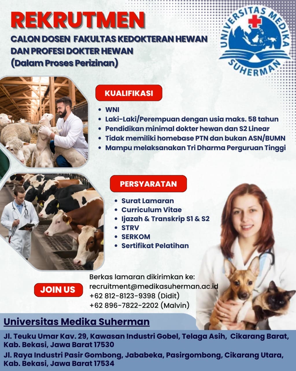 Rekrutmen Dosen Fakultas Kedokteran Hewan dan Profesi Dokter Hewan Universitas Medika Suherman oleh Humas | Mar 24, 2025 | Loker | 0 Komentar Kirim Komentar Batalkan balasanAlamat email Anda tidak akan dipublikasikan. Ruas yang wajib ditandai *Komentar * Nama * Email * Situs Web Simpan nama, email, dan situs web saya pada peramban ini untuk komentar saya berikutnya.