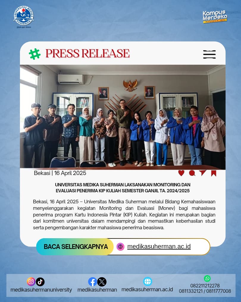 Bekasi, 16 April 2025 – Universitas Medika Suherman melalui Bidang Kemahasiswaan menyelenggarakan kegiatan Monitoring dan Evaluasi (Monev) bagi mahasiswa penerima program Kartu Indonesia Pintar (KIP) Kuliah. Kegiatan ini merupakan bagian dari komitmen universitas dalam mendampingi dan memastikan keberhasilan studi serta pengembangan karakter mahasiswa penerima beasiswa.