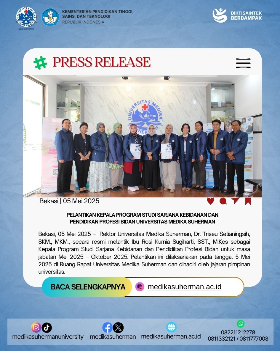 Bekasi, 5 Mei 2025 – Rektor Universitas Medika Suherman, Dr. Triseu Setianingsih, SKM., MKM., secara resmi melantik Ibu Rosi Kurnia Sugiharti, SST., M.Kes sebagai Kepala Program Studi Sarjana Kebidanan dan Pendidikan Profesi Bidan untuk masa jabatan Mei 2025 – Oktober 2025. Pelantikan ini dilaksanakan pada tanggal 5 Mei 2025 di Ruang Rapat Universitas Medika Suherman dan dihadiri oleh jajaran pimpinan universitas.