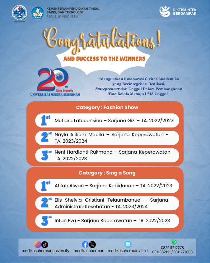 Universitas Medika Suherman mengucapkan selamat kepada para mahasiswa yang telah meraih juara dalam Lomba Fashion Show dan Sing a Song pada rangkaian acara Dies Natalis 2025.
