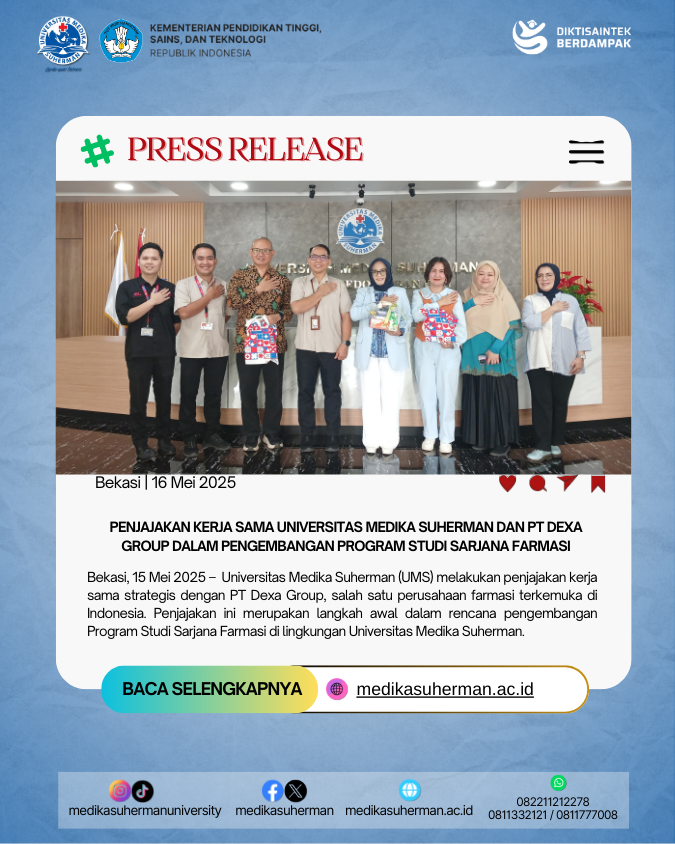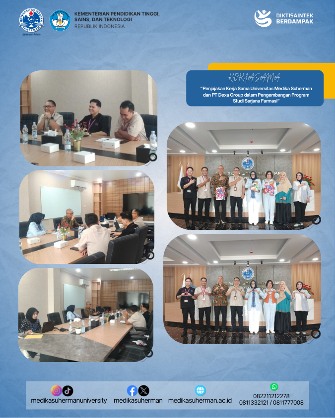 Bekasi, 15 Mei 2025 – Universitas Medika Suherman (UMS) melakukan penjajakan kerja sama strategis dengan PT Dexa Group, salah satu perusahaan farmasi terkemuka di Indonesia. Penjajakan ini merupakan langkah awal dalam rencana pengembangan Program Studi Sarjana Farmasi di lingkungan Universitas Medika Suherman.