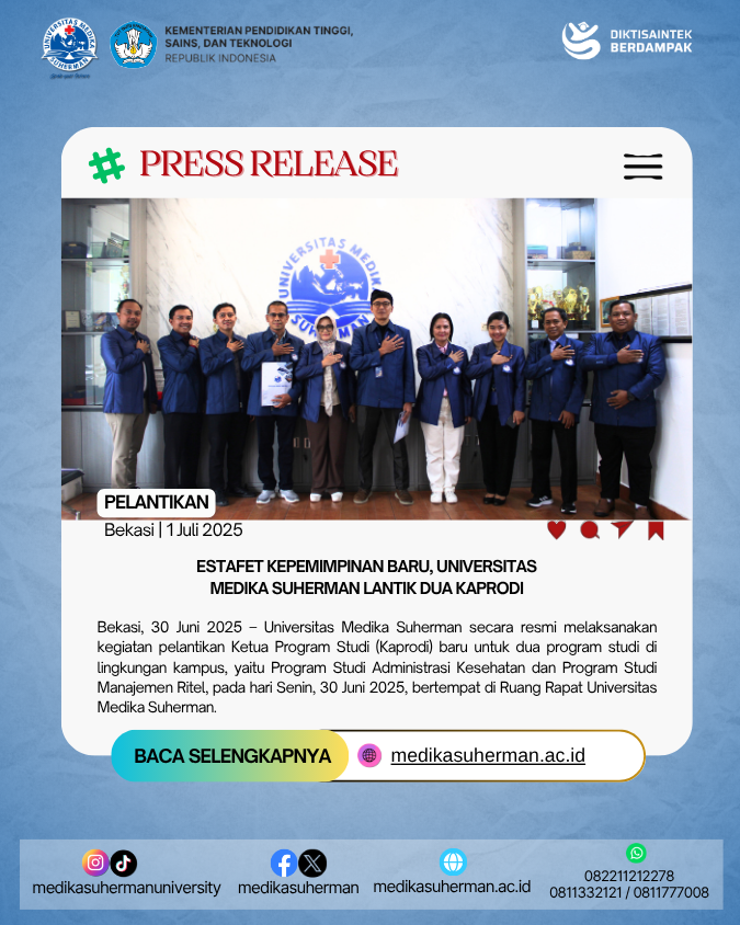 Universitas Medika Suherman secara resmi melaksanakan kegiatan pelantikan Ketua Program Studi (Kaprodi) baru untuk dua program studi di lingkungan kampus, yaitu Program Studi Administrasi Kesehatan dan Program Studi Manajemen Ritel, pada hari Senin, 30 Juni 2025, bertempat di Ruang Rapat Universitas Medika Suherman.