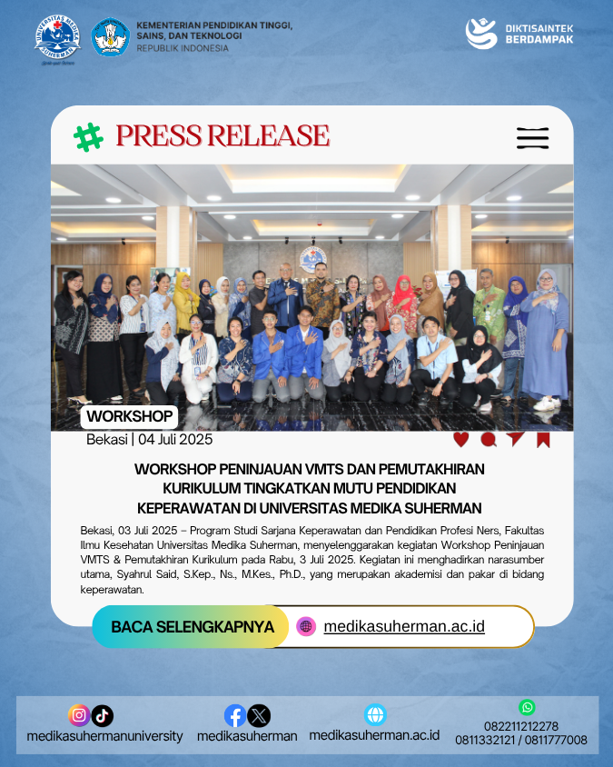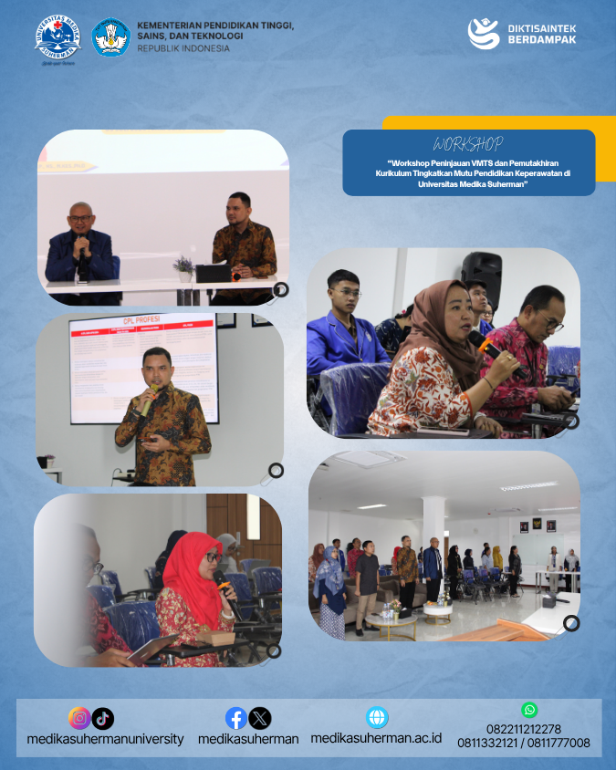 Bekasi, 03 Juli 2025 – Program Studi Sarjana Keperawatan dan Pendidikan Profesi Ners, Fakultas Ilmu Kesehatan Universitas Medika Suherman, menyelenggarakan kegiatan Workshop Peninjauan VMTS & Pemutakhiran Kurikulum pada Rabu, 3 Juli 2025. Kegiatan yang berlangsung dari pukul 08.00 hingga 16.30 WIB ini menghadirkan narasumber utama, Syahrul Said, S.Kep., Ns., M.Kes., Ph.D., yang merupakan akademisi dan pakar di bidang keperawatan.
