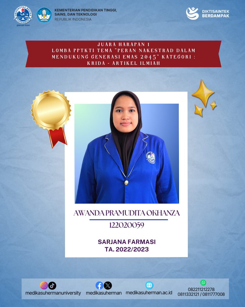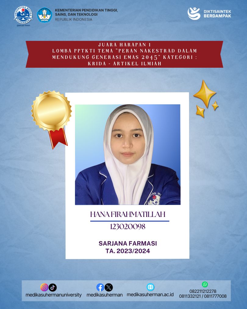 Selamat kepada Mahasiswa Sarjana Farmasi yang berhasil meraih Juara Harapan 1 Lomba PPTKTI Tema “Peran Nakestrad dalam Mendukung Generasi Emas 2045” Kategori : KRIDA – Artikel Ilmiah yang diselenggarakan oleh Organisasi PPTKTI (Perkumpulan Pendidikan Tinggi Kesehatan Tradisional Indonesia).