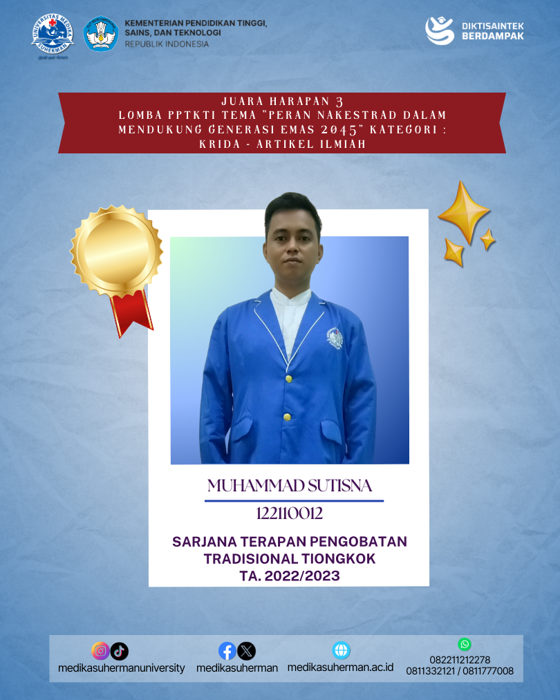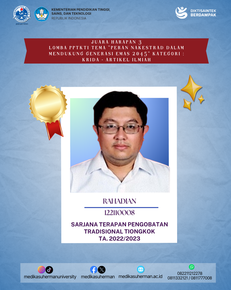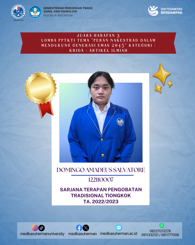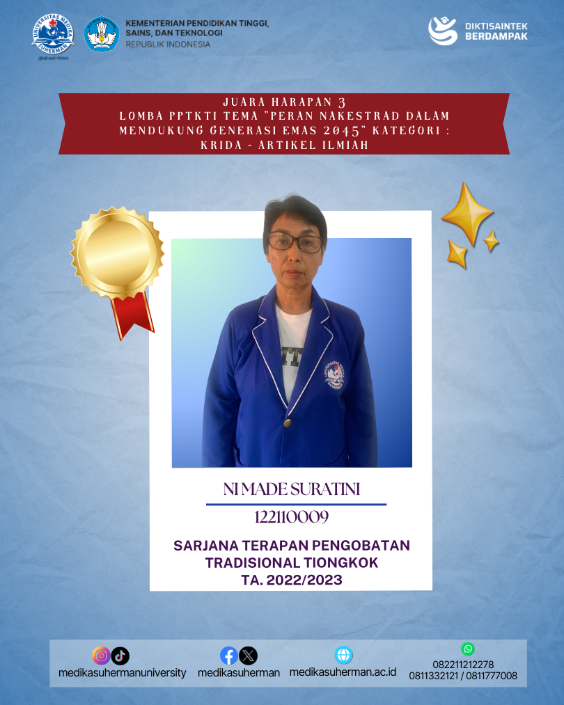 Selamat kepada Mahasiswa Sarjana Terapan Pengobatan Tradisional Tiongkok yang berhasil meraih Juara Harapan 3 Lomba PPTKTI Tema “PERAN NAKESTRAD DALAM MENDUKUNG GENERASI EMAS 2045” Kategori : KRIDA – Artikel Ilmiah yang diselenggarakan oleh Organisasi PPTKTI (Perkumpulan Pendidikan Tinggi Kesehatan Tradisional Indonesia).