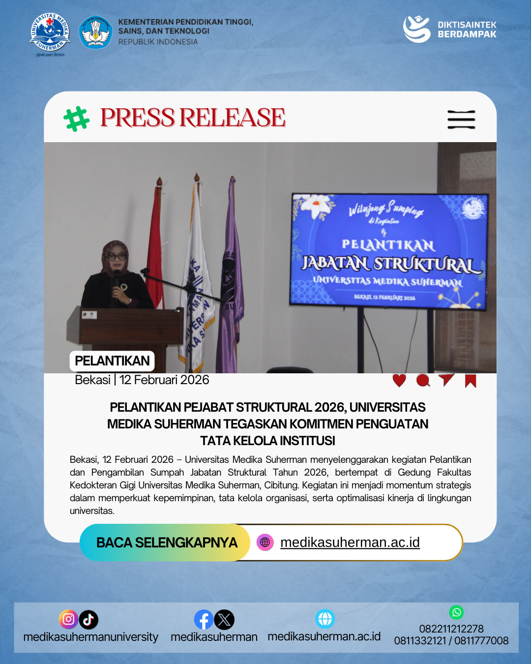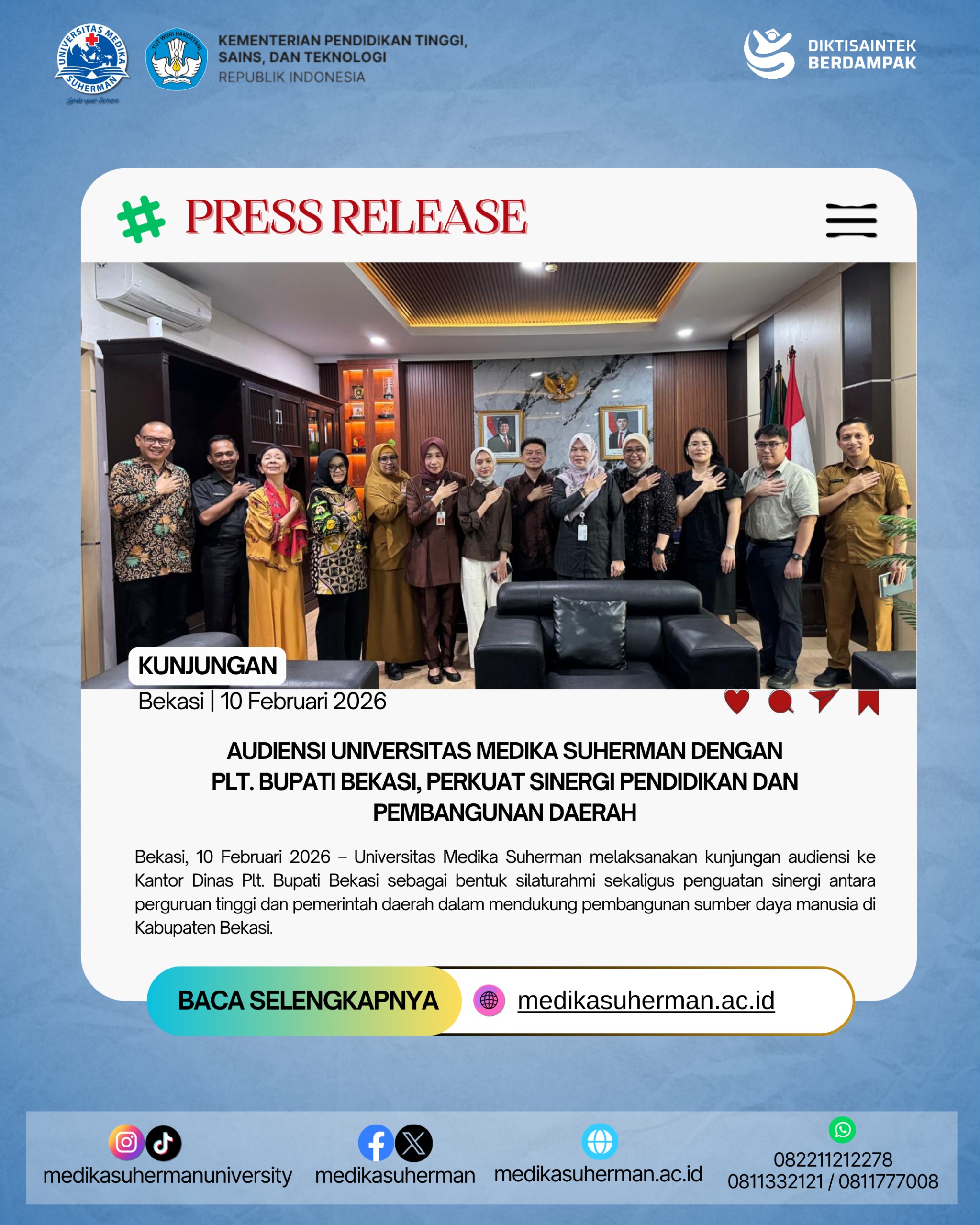Melalui kunjungan ini, Universitas Medika Suherman kembali menegaskan komitmennya untuk menjadi institusi pendidikan yang unggul, berdaya saing global, dan berkontribusi nyata dalam pengembangan ilmu pengetahuan serta kesehatan masyarakat.